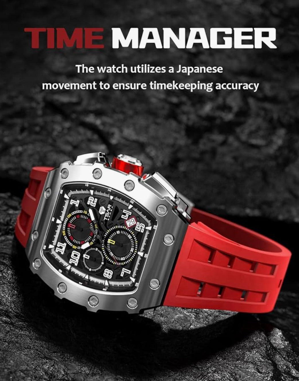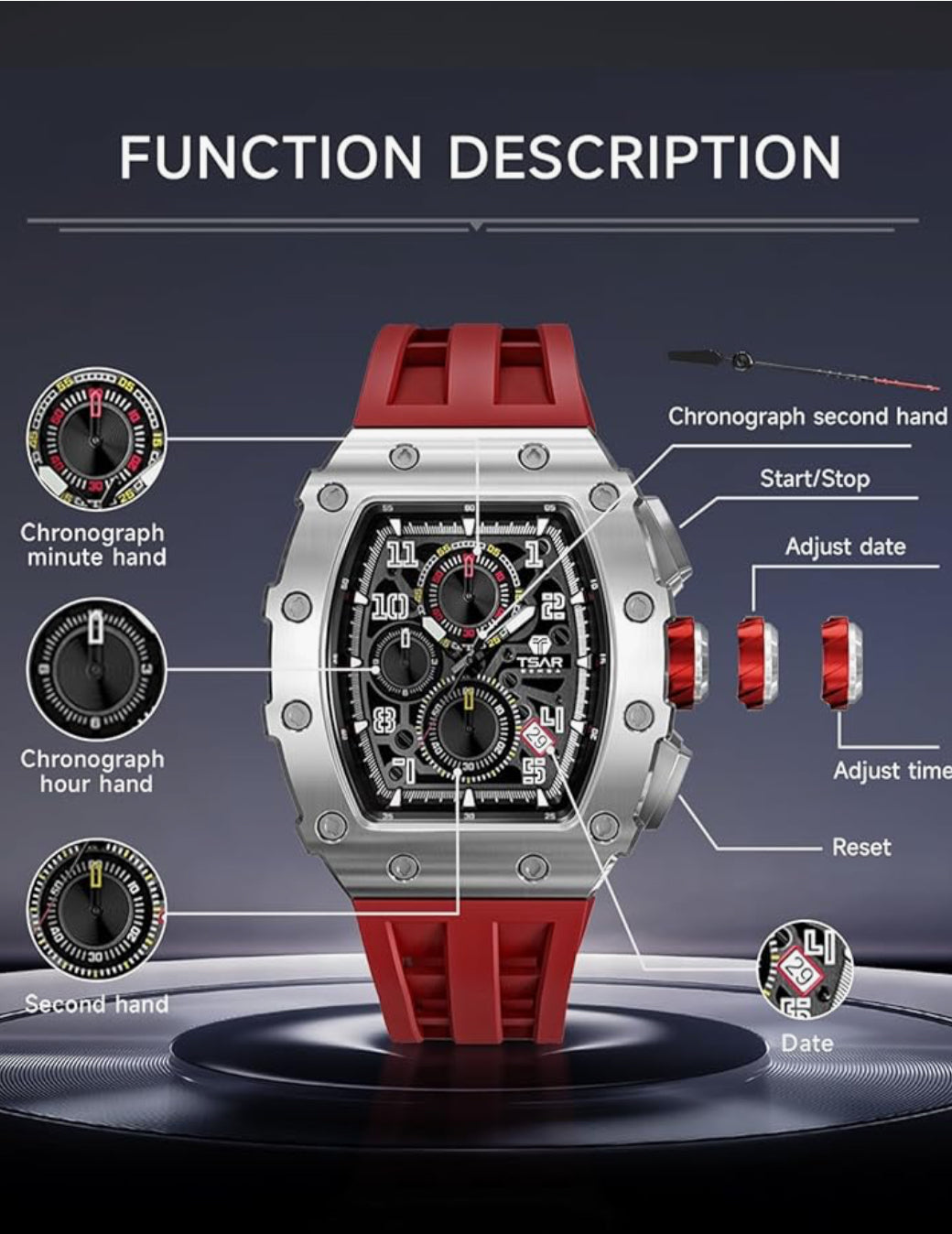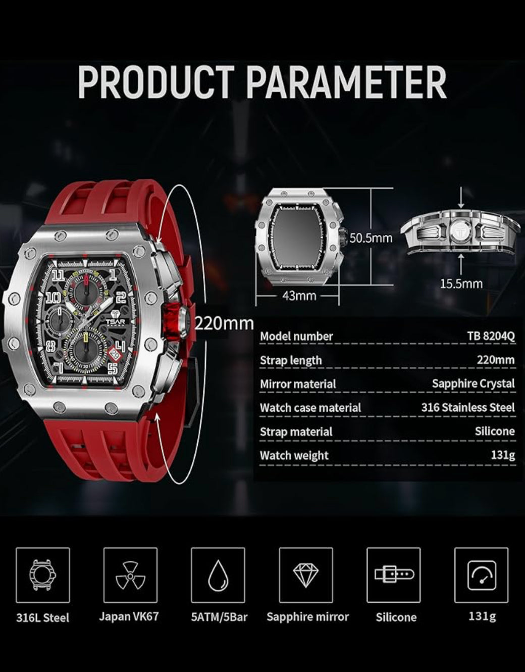 Orologio Uomo Tonneau Design Impermeabile 50M con Cinturino in 316 Acciaio Lunetta Regalo Uomo Militare Cronografo Orologio da Design Elegante